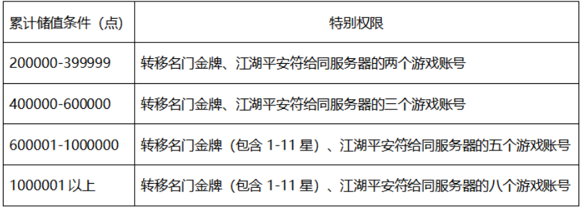 满足参与条件的游戏账号,可参照下表,在申请时间区间内,以“飞鸽”方式联系GM提交申请,将游戏账号拥有的名门金牌、江湖平安符转移给同服务器的其他游戏账号。