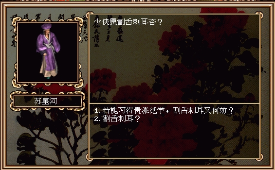2.进入逍遥派之后与逍遥派-苏星河(聪辨山庄674,530)对话,选择“割舌刺耳?”,若是选择“若能习得贵派绝学,割舌刺耳又何妨?”则现实一周左右时间无法加入逍遥派