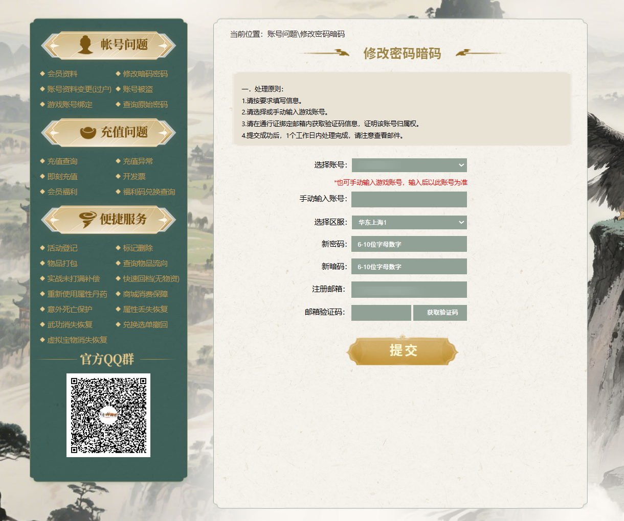 修改当前登录会员账号下任意游戏账号的密码和暗码,填写验证码后即可提交工单。(1 个工作日内处理,邮箱内回复处理进度)。