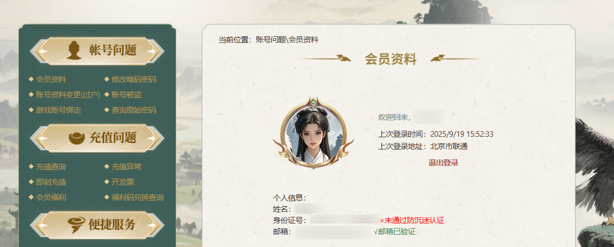 查询会员账号绑定个人信息,含姓名、身份证、完整绑定邮箱(大侠们切勿泄露)。