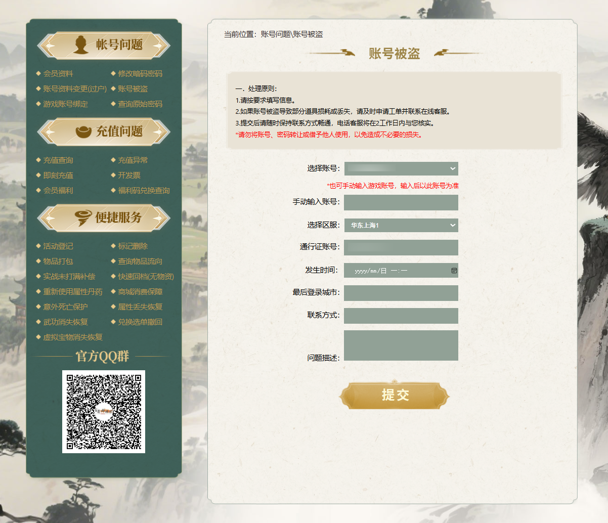 如果大侠的游戏账号被其他人登录出现了意外情况,可以在这里进行问题的提交。工作人员会尽快联系您提供的手机号帮您解决问题。同时还要提醒您,请勿将账号、密码转让或借予他人使用,以免造成不必要的损失