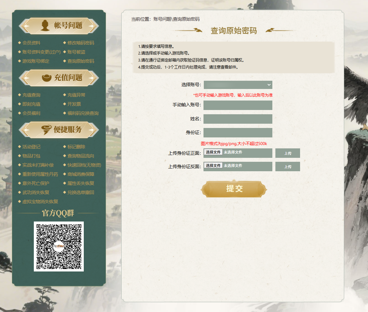 客服中心集成【账号问题】、【充值问题】、【便捷服务】、三大模块,覆盖江湖日常需求: