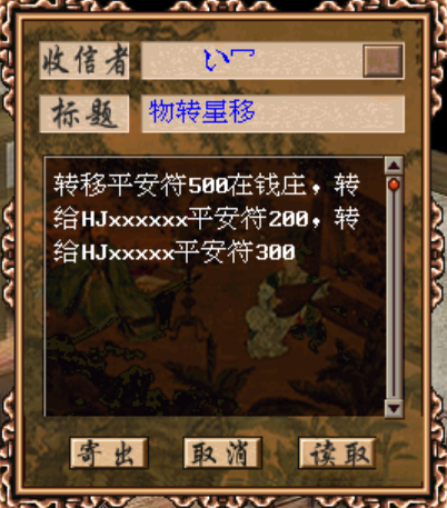 转移名门金牌、江湖平安符、pk丹药、天王保命丹(绑)礼盒给同服务器的三个游戏账号 |