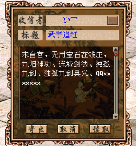 2、若您需要参加活动,请在活动期间通过指令→杂项→寄信给客服中心提交申请,提交以下信息:角色自宫状态,无用宝石数量、存放位置,需要提升武功的准确名称,QQxxxxxxxxxxx。信息范例:未自宫(自宫),无用宝石在钱庄,九阴神爪,QQxxxxxxx。